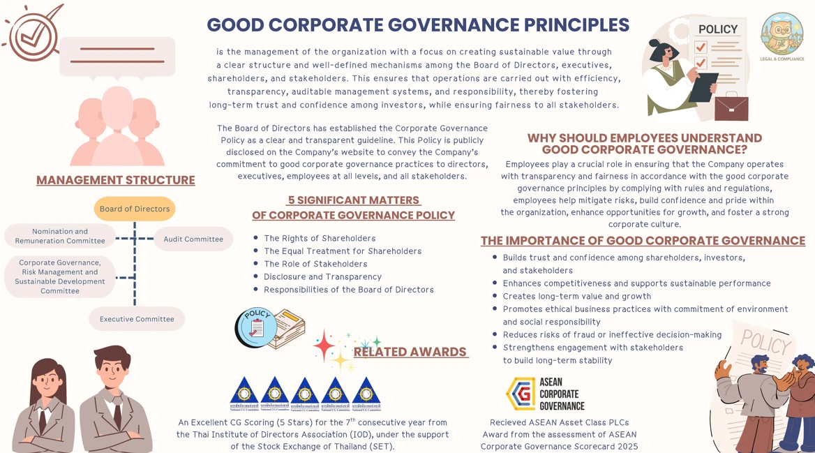 Amid the rapidly evolving business environment and increasing expectations regarding sustainability and corporate governance, the Company faces challenges in further strengthening its corporate governance practices to align with more stringent standards and requirements. These include enhanced ASEAN CG Scorecard criteria aligned with the G20/OECD Principles of Corporate Governance, the preparation of the Annual Report (Form 56-1 One Report), and disclosure requirements in accordance with the guidelines of the Securities and Exchange Commission and the Stock Exchange of Thailand. These developments raise expectations regarding transparency, completeness, and the verifiability of corporate governance information.