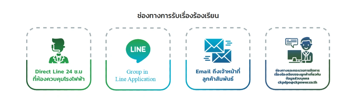 เกี่ยวกับข้อมูลส่วนบุคคล ckpdpo@ckpower.co.thบริษัทจัดให้มีช่องทางการสื่อสารสำหรับรับเรื่องร้องเรียนและแก้ปัญหาร่วมกัน รวมถึงการสำรวจความพึงพอใจของลูกค้า ผ่านช่องทางต่าง ๆ