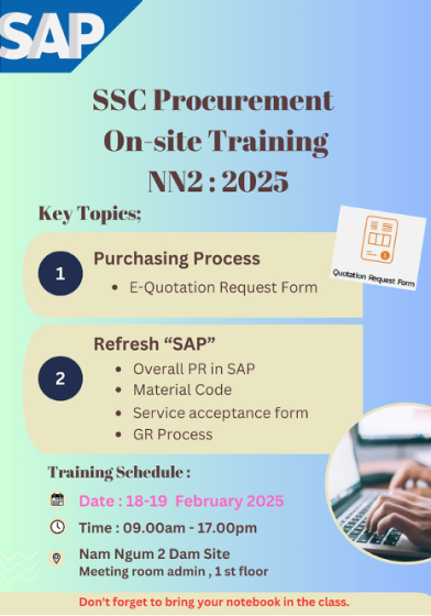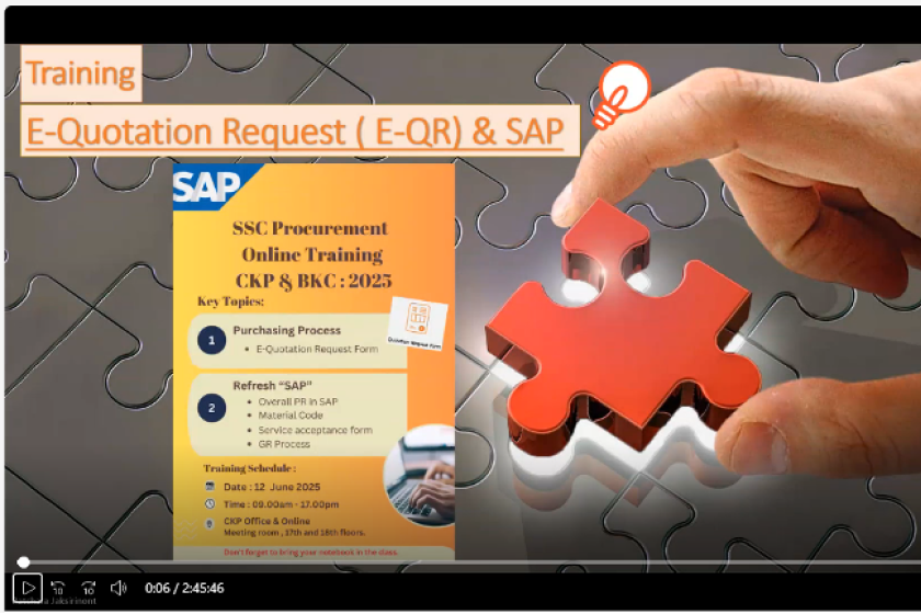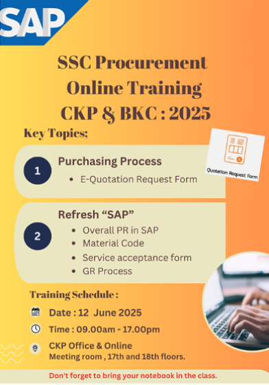 | การเปลี่ยนแปลงกระบวนการ SAP สำหรับการเปิดคำขอสั่งซื้อ (Purchase Requisition: PR) และการรับสินค้า (Goods Receipt: GR) | เสริมความเข้าใจภาพรวมกระบวนการทำงานในระบบ SAP รูปแบบใหม่ ตั้งแต่การเปิดคำขอสั่งซื้อ (PR) จนถึงการรับสินค้า (GR) โดยมุ่งให้ผู้เข้าร่วมรับทราบภาพรวมและความเข้าใจที่ชัดเจนเกี่ยวกับกระบวนการทำงานในระบบ SAP รูปแบบใหม่ ตั้งแต่การเปิดคำขอสั่งซื้อ (PR) จนถึงการรับสินค้า (GR) เตรียมความพร้อมในการปรับตัวต่อการเปลี่ยนแปลงของกระบวนการทำงาน ลดความสับสนและความผิดพลาดในการปฏิบัติงานจริงเพิ่มประสิทธิภาพในการประสานงานระหว่างฝ่ายจัดซื้อ หน่วยงานที่เกี่ยวข้อง และทีมโครงการ SAP สนับสนุนการดำเนินงานด้านจัดซื้อจัดจ้างให้เป็นไปอย่างเป็นระบบ โปร่งใส และตรวจสอบได้ สอดคล้องกับแนวทางการทำงานใหม่ขององค์กร |