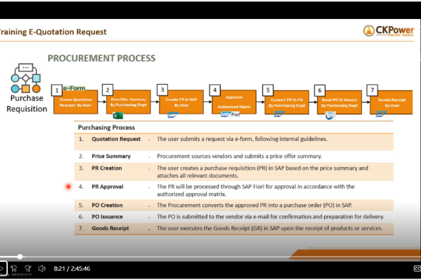 แผนกจัดซื้อได้จัดอบรมกระบวนการจัดซื้อจัดจ้างให้กับพนักงานภายในองค์กรในวันที่ 18-19 กุมภาพันธ์ และ 12 มิถุนายน 2568 โดยมีกลุ่มเป้าหมายเป็นพนักงานของบริษัทที่ทำหน้าที่เกี่ยวข้องกับกระบวนการจัดซื้อจัดจ้าง รวมถึงผู้ใช้งานระบบ SAP ในขั้นตอนสำคัญ เช่น การเปิดคำขอสั่งซื้อ (PR), Material Code, Service Acceptance และ กระบวนการรับสินค้า (GR Process)